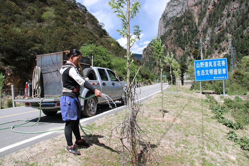 植樹(shù)容易,保持存活率很難。“植樹(shù)植樹(shù),一分栽九分管。我們植樹(shù)造林不只看數(shù)量,更注重質(zhì)量,注重栽植方法和科學(xué)的后期養(yǎng)護(hù)管理,保證樹(shù)木的成活率。”6月11日,在白玉縣絨蓋鄉(xiāng),長(zhǎng)江造林局駐白玉管護(hù)站站長(zhǎng)梁榮忙著進(jìn)行現(xiàn)場(chǎng)管護(hù)技術(shù)指導(dǎo),“把遮陽(yáng)網(wǎng)裹緊點(diǎn)、把刺巴綁緊點(diǎn),以免牛和馬啃皮子;水要澆透,不然水分不夠,樹(shù)子一斷水,再想‘返陽(yáng)’就難了;護(hù)欄水泥樁要栽牢,不然牛馬一撞就倒了……”。