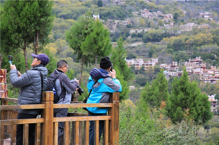 游客在甲居藏寨拍照留影。