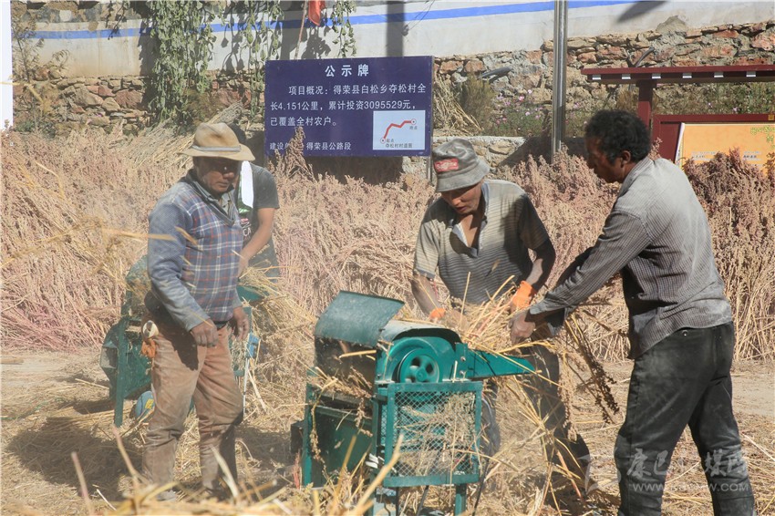 金秋的陽(yáng)光熾熱溫暖,得榮縣白松鎮(zhèn)奪松村一片祥和安寧。11月10日,村民們正在村活動(dòng)室的院壩里脫粒藜麥,豐收的喜悅寫在忙碌的村民的臉上?!按蠹壹佑透?,把藜麥交給公司,立馬可以拿到現(xiàn)錢?!眾Z松村委會(huì)副主任四郎都遷高興地說(shuō),盤點(diǎn)收成,今年又是一個(gè)豐收年。