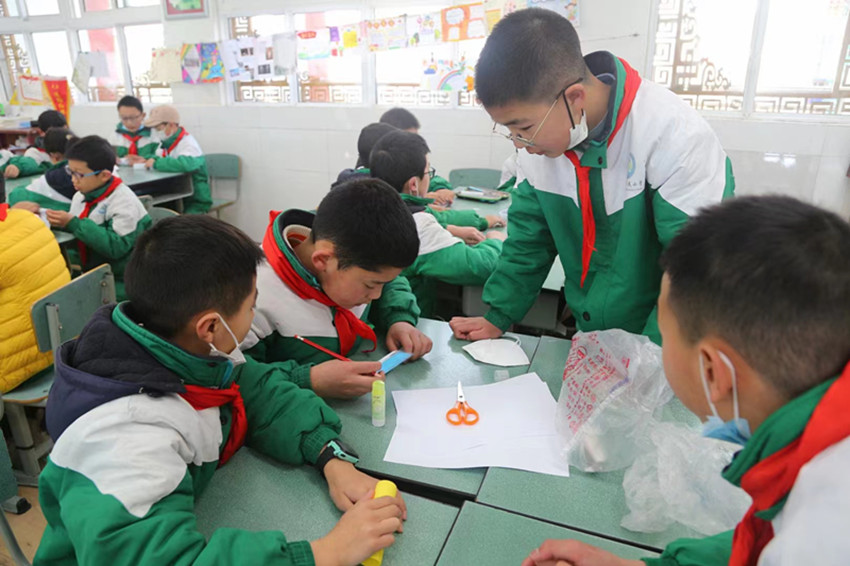 駐軍官兵給學生上國防教育課。