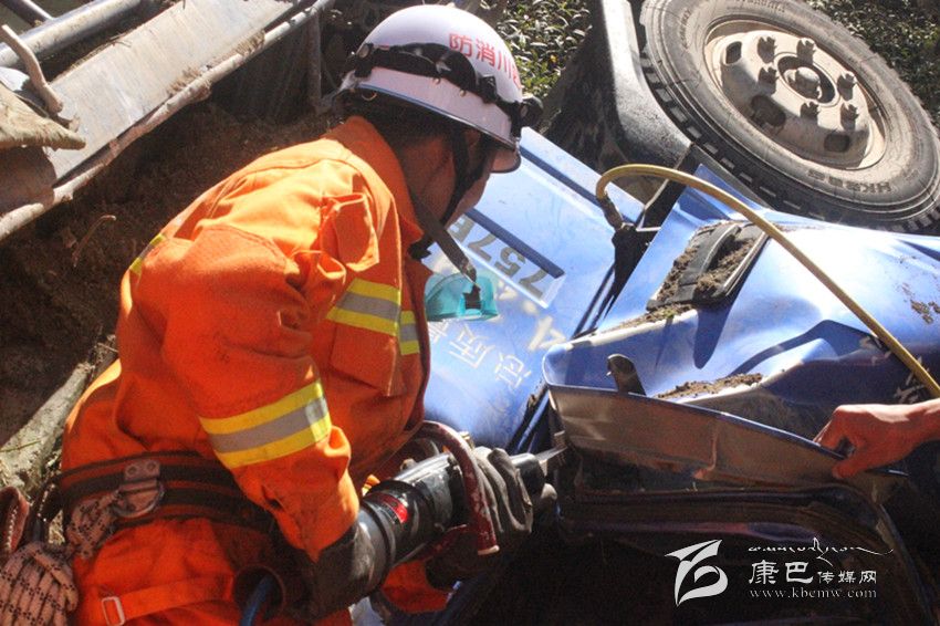 接警后,支隊(duì)指揮中心賡即調(diào)集1臺(tái)搶險(xiǎn)救援車(chē)和8名消防官兵火速趕往事發(fā)現(xiàn)場(chǎng),實(shí)施救援。10時(shí)43分左右,消防官兵抵達(dá)事發(fā)現(xiàn)場(chǎng)。經(jīng)現(xiàn)場(chǎng)調(diào)查,了解側(cè)翻卡車(chē)是因剎車(chē)失靈發(fā)生事故,車(chē)頭被嚴(yán)重?cái)D壓變形,駕駛室中有一名被困人員被卡住無(wú)法動(dòng)彈?,F(xiàn)場(chǎng)情況十分緊急,指揮員立即組織安全員對(duì)事故現(xiàn)場(chǎng)安置警戒帶、警戒標(biāo)識(shí);破拆小組利用液壓擴(kuò)張剪斷器等救援器械對(duì)車(chē)內(nèi)被困人員實(shí)施破拆救援。20分鐘后,在消防官兵的努力下,受困人員被成功救出。