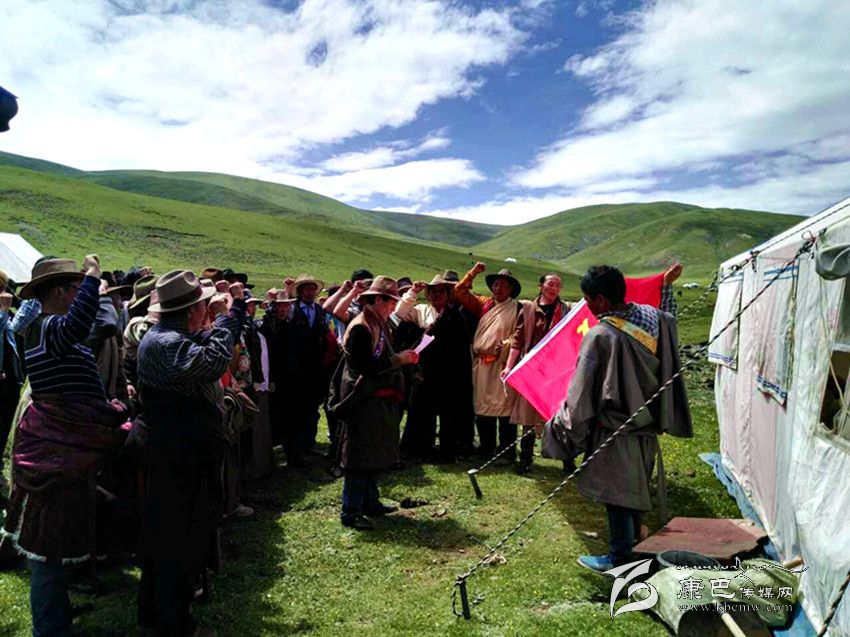 石渠縣牧民黨員在帳篷前重溫入黨誓詞。