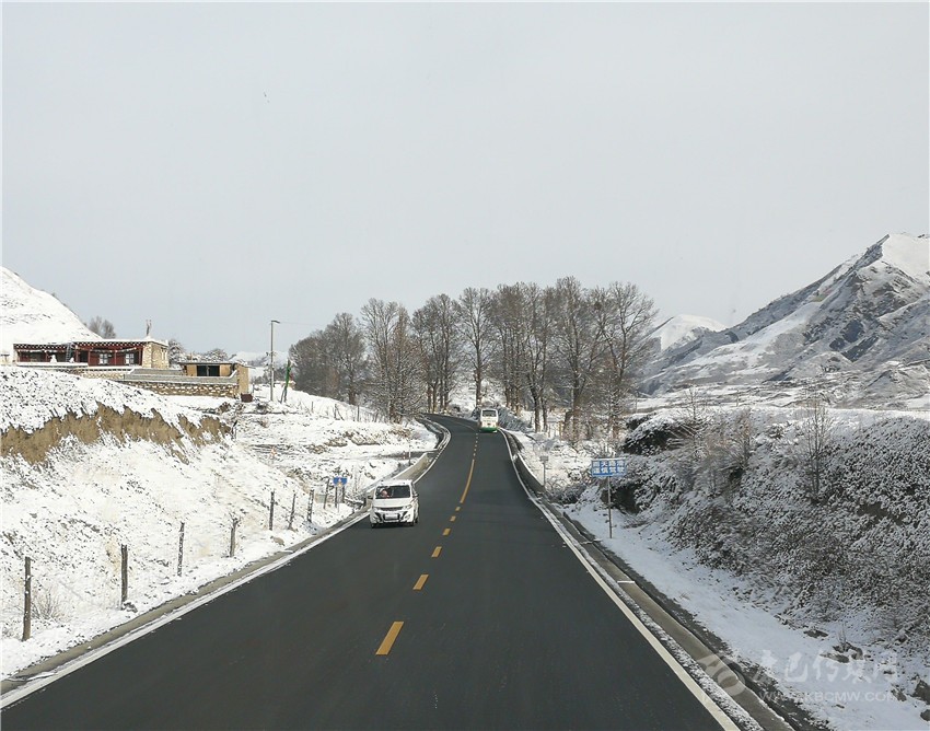安全通過折多山后,天已完全放亮,只見道路兩邊的山丘、草地和樹木全被積雪覆蓋,與之形成鮮明對比的是一條寬闊平整的黑色柏油路,整個畫面就像一幅水墨畫,而我們這車人就行進(jìn)在“畫中”。