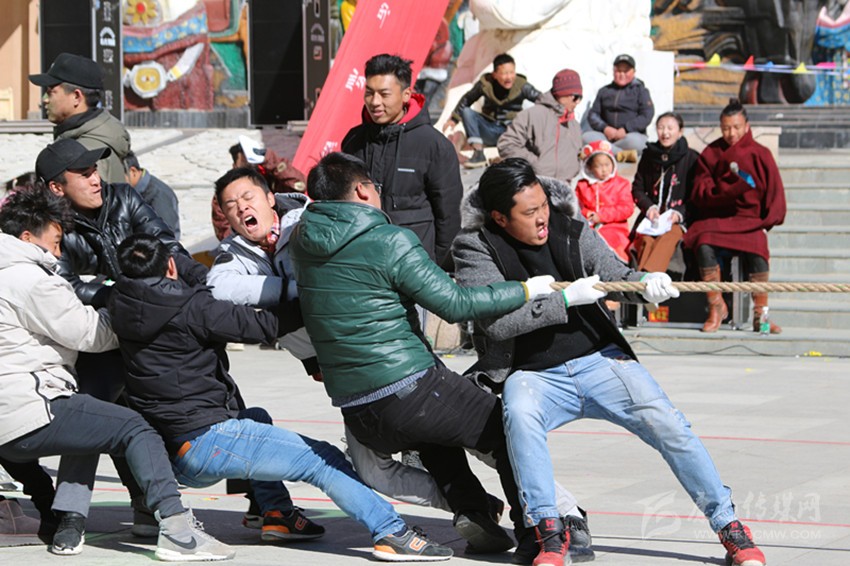 趣味比賽將干部職工和高城鎮(zhèn)農牧民群眾分成若干個小組進行比賽,“翻山越嶺 ”游戲,男生普遍輕松應對,女生由于沒有助跑,一直栽在“山坡上”翻不過去,引得現(xiàn)場觀眾大笑,最后在現(xiàn)場觀眾的齊聲加油下終于翻過。跳繩、袋鼠跳,參賽選手較勁比拼。“勇敢者”游戲,組員需先轉10個呼啦圈、踢毽10下、吹爆一個氣球、跳繩10下、喝完一瓶330毫升的礦泉水進行接力,現(xiàn)場氣氛熱烈,觀眾的加油吶喊聲此起彼伏?!疤箍舜髴?zhàn)”游戲考驗了大家協(xié)調配合能力,把觀眾的心都提到嗓子眼。最引人注目的拔河比賽開始了,每個隊都帶著勢在必得的勇氣上場,結果年輕小伙們卻輸給了高城鎮(zhèn)農牧民代表隊。