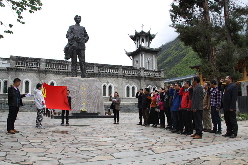 本網(wǎng)訊 (本網(wǎng)記者 秦松 攝影報道)日前,甘孜日報社全體黨員與群眾工作全覆蓋結(jié)對共建共創(chuàng)的海螺溝燕子溝鎮(zhèn)的躍進(jìn)坪村支部、南門關(guān)村支部、麻柳林村支部、喇嘛溝村支部的黨員,懷著崇敬的心情來到磨西長征紀(jì)念館毛主席塑像前,舉行緬懷革命先烈、重溫入黨誓詞活動。活動中,黨員們還與共建共創(chuàng)支部黨員進(jìn)行了座談。圖為宣誓活動現(xiàn)場。