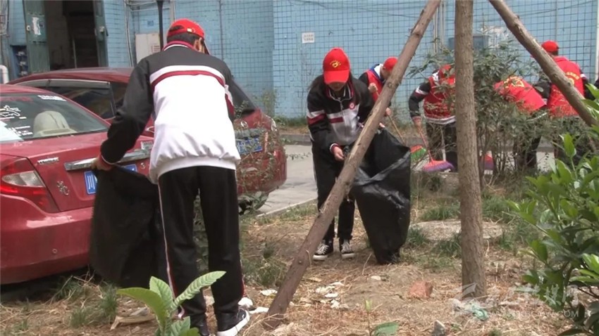 志愿者打掃小區(qū)衛(wèi)生。