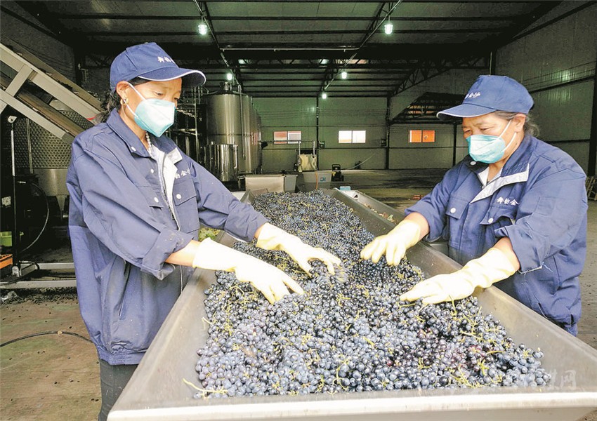 秋高氣爽的時節(jié)里,步入得榮縣瓦卡村和因都壩村,田野間隨處可見村民們熱火朝天采摘葡萄的景象,滿載豐收喜悅的三輪車來回馳騁在田間小道。而在葡萄釀酒車間里,工人們正嫻熟地操作機器,對一串串黑珍珠般的葡萄進行穗選、粒選、脫梗。