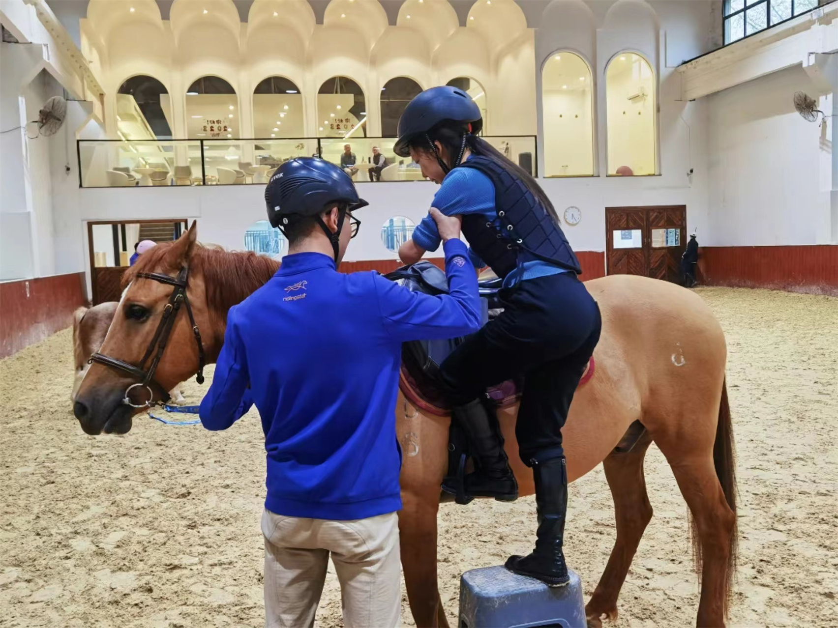 許方燕在教練幫助下登馬參訓(xùn)。