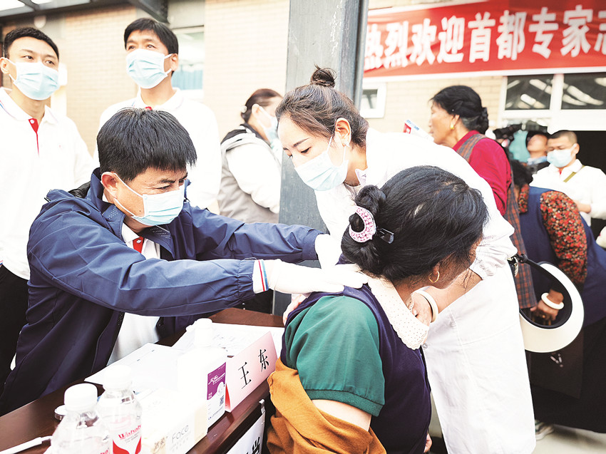 排隊、分診、診斷……在巴塘縣義診現(xiàn)場,每一位身著白衣、口音輕柔的醫(yī)生面前都有數(shù)名等待問診的群眾。來自北京大學(xué)第一醫(yī)院、解放軍第八醫(yī)學(xué)中心、北京航天總醫(yī)院等醫(yī)療機構(gòu),涵蓋腎臟、中醫(yī)、骨科、肝病科疾病等多個領(lǐng)域的專家團隊正為前來問診的群眾提供多學(xué)科專業(yè)義診服務(wù),并就常見疾病耐心細致地為患者及家屬答疑解惑。