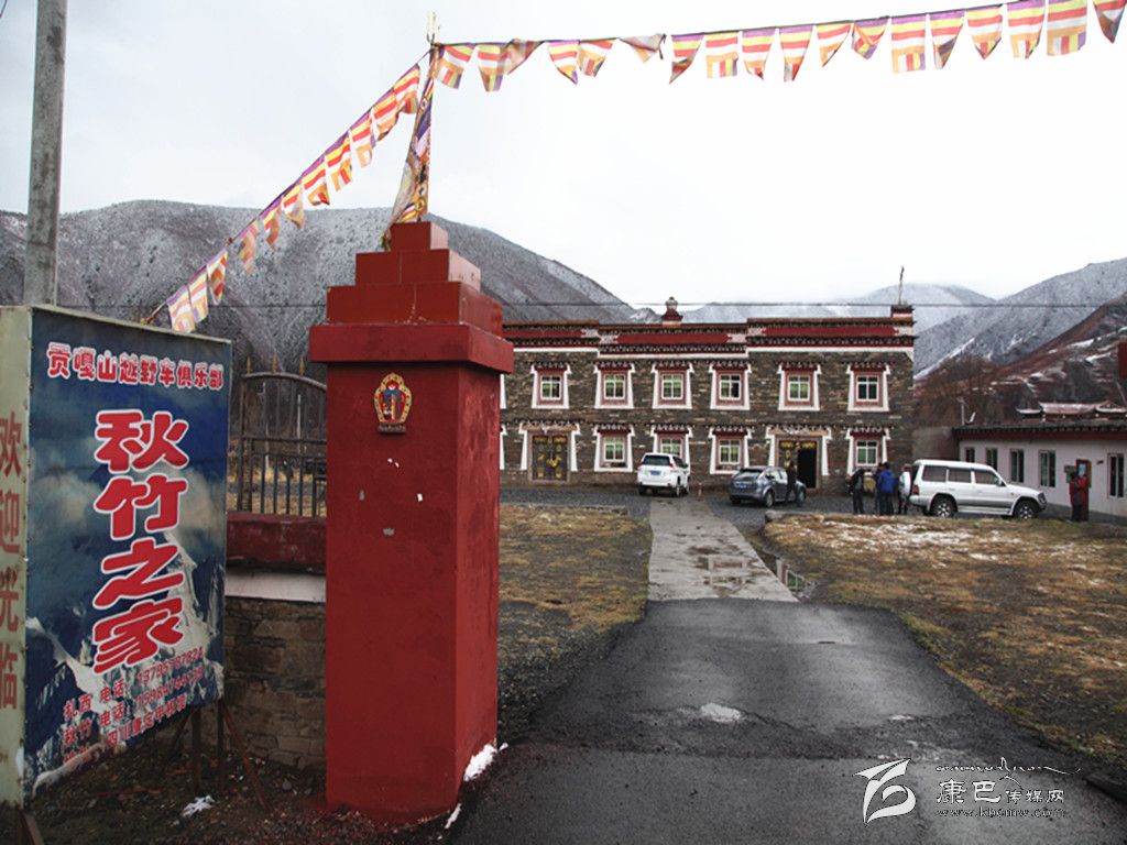 在距鄉(xiāng)政府不遠(yuǎn)的營(yíng)九路邊上,有一個(gè)“貢嘎山越野車(chē)俱樂(lè)部·秋竹之家”的燈箱廣告。在雪山的映襯下,這個(gè)不大的燈箱廣告顯得格外引人注目。步入“秋竹之家”的大門(mén),進(jìn)入眼簾的是一幢民族風(fēng)格濃郁的建筑,黑白紅三色相間的墻面,還沒(méi)有吐綠的院壩,所有的一切,都讓記者看不出這幢建筑與普通民居有什么不同的地方。