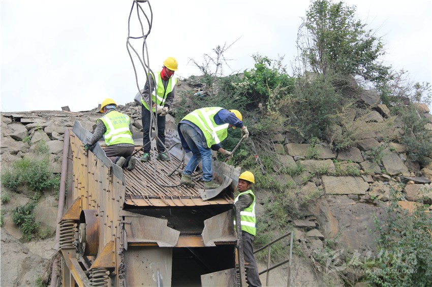 8月25日,塔公村采砂場(chǎng)早已停止了一切生產(chǎn)。記者在現(xiàn)場(chǎng)看到,起重機(jī)正將砂場(chǎng)里10多米長(zhǎng),非常笨重的傳送帶拆放在地上。數(shù)十名村民和工人一起,用挖機(jī)、吊車、氣割機(jī)等設(shè)備將生產(chǎn)砂石的設(shè)備進(jìn)行拆解,拆除的生產(chǎn)設(shè)備、機(jī)械零件整齊地?cái)R置一旁,砂場(chǎng)拆除工作正在安全有序進(jìn)行。望著曾經(jīng)給村民帶來(lái)巨大效益的設(shè)備被拆解在地上,塔公村村主任伍金多吉流下了傷心的淚水。