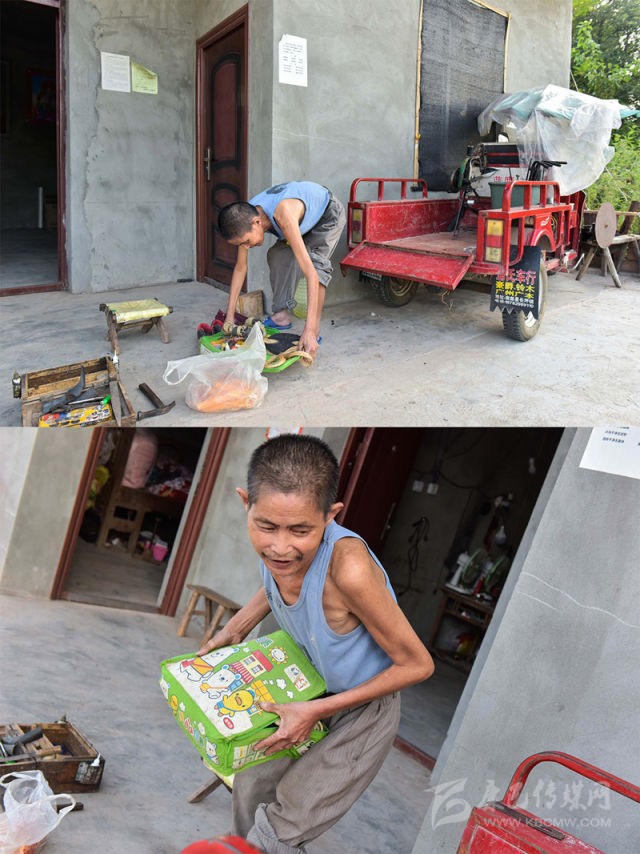 “周強(qiáng)善曾是全鄉(xiāng)最困難的貧困戶。”中心鄉(xiāng)黨委書記楊壘說,周強(qiáng)善的妻子在剛生下女兒后因病去世。2005年,他在外務(wù)工時右腿受傷,留下殘疾。后來他自學(xué)補(bǔ)鞋技術(shù),成了一名鞋匠,但腿腳不便、下山路不通,三娃多年“悶”在家里。