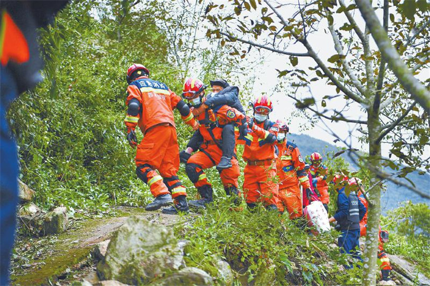 救援隊(duì)員協(xié)助紫雅場(chǎng)村最后一批村民下山,他們隨后將通過(guò)水路轉(zhuǎn)移至設(shè)在得妥鎮(zhèn)場(chǎng)鎮(zhèn)的受災(zāi)群眾安置點(diǎn)。 四川日?qǐng)?bào)全媒體記者 楊樹 攝