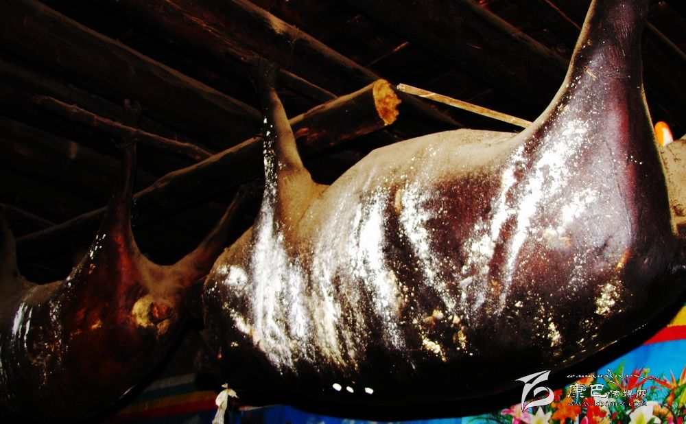 臭豬肉用扎壩語準(zhǔn)確翻譯應(yīng)譯“陳豬肉”或“舊豬肉”。由于其惡味乍聞重于“臭豆腐”,濃于廣東的“酶香咸魚”,所以稱“臭豬肉”。但扎壩人卻視之為上品,極其愛吃,并作為居家待客的最高珍品,家家戶戶都要熏制存放,且越存放得久越被視為珍貴,因此,在扎壩地區(qū),家中懸掛多少“臭豬肉 ”和懸掛的年限多少也自然成為當(dāng)?shù)睾饬控毟坏南笳鳌?br />     “臭豬肉”的制作過程和來歷:豬用玉米和麥子喂肥后,用繩索套豬頸勒死,在其胸開一小口將豬心血脈弄斷,使肉中的血全部流回到內(nèi)臟中,再把所有的內(nèi)臟從小口中取出,并填上青稞、麥子等谷物后縫合,再用灶灰和紅土塞住七竅,把氣吹脹,埋在麥糠中10余天吸干水,取出掛在灶上的房梁上自然煙熏數(shù)年即成。其懸掛年限可達(dá)10年以上,最長(zhǎng)的可達(dá)30余年。食用時(shí),隨用隨取,做法也很多,可生吃,可煮食,也可熬湯。扎壩人多愛生吃,初嘗入口難適,多食后方覺滿口濃香,回味無窮。過去是為防備戰(zhàn)事而儲(chǔ)備食品,后來就逐漸成為當(dāng)?shù)氐囊环N飲食習(xí)俗和主要食品了。