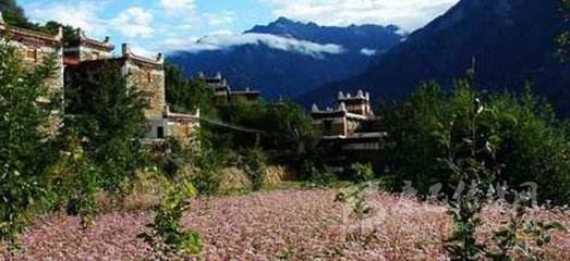 在青山腳下,綠樹環(huán)抱,小溪流徑之地,遠遠地便能看見屋檐下、窗戶的壁墻上勾畫著象征純潔白線的藏寨民居。一幢幢藏寨民居那么和諧地與大自然構(gòu)成一幅美麗的風景。